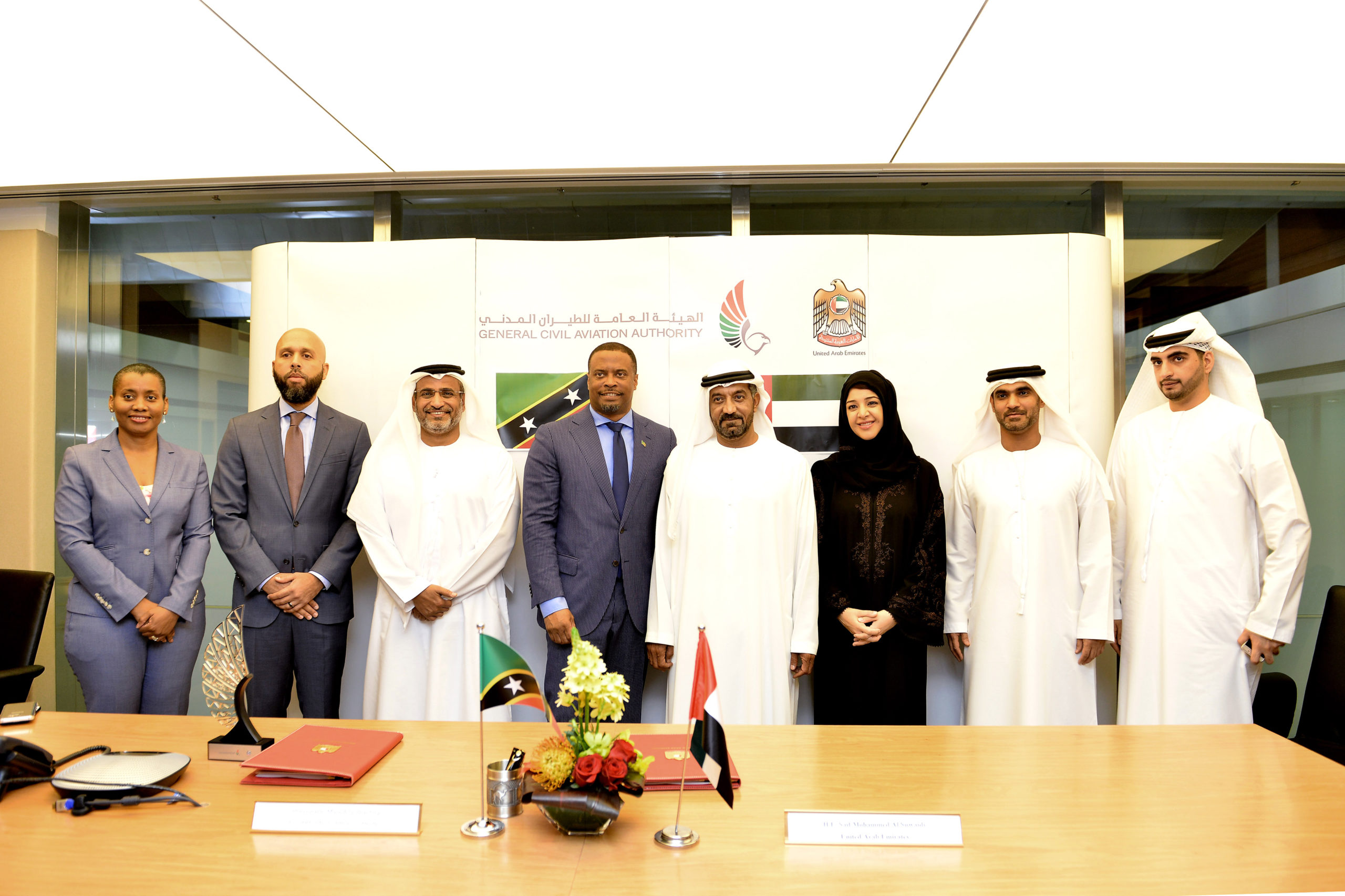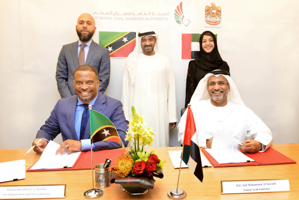 Dubai, United Arab Emirates (20 November 2016) – Today 20th November, 2016 marked an historic day in the relationship between St Kitts and Nevis and the United Arab Emirates as officials of both countries met in Dubai to sign an Air Services Agreement which is intended to pave the way for future air traffic between the two countries. In a high level ministerial meeting before the signing, St Kitts Nevis Foreign Minister Mark Brantley met with His Highness Sheikh Ahmed bin Saeed Al Makotoum, (Chairman and CEO Emirates Airline, Dubai Aviation City Corporation, Dubai World, Flydubai, Noor Islamic Bank PJSC, Noor Investment Group, Noor Takaful General PJSC, and Noor Takaful Family PJSC) and Her Excellency Reem Ebrahim Al-Hashimi (Minister of State and Cooperation and Managing Director for the Dubai World Expo 2020 Bid Committee) to discuss a wide range of issues centred around the deepening and broadening of relations between St. Kitts and Nevis and the UAE.