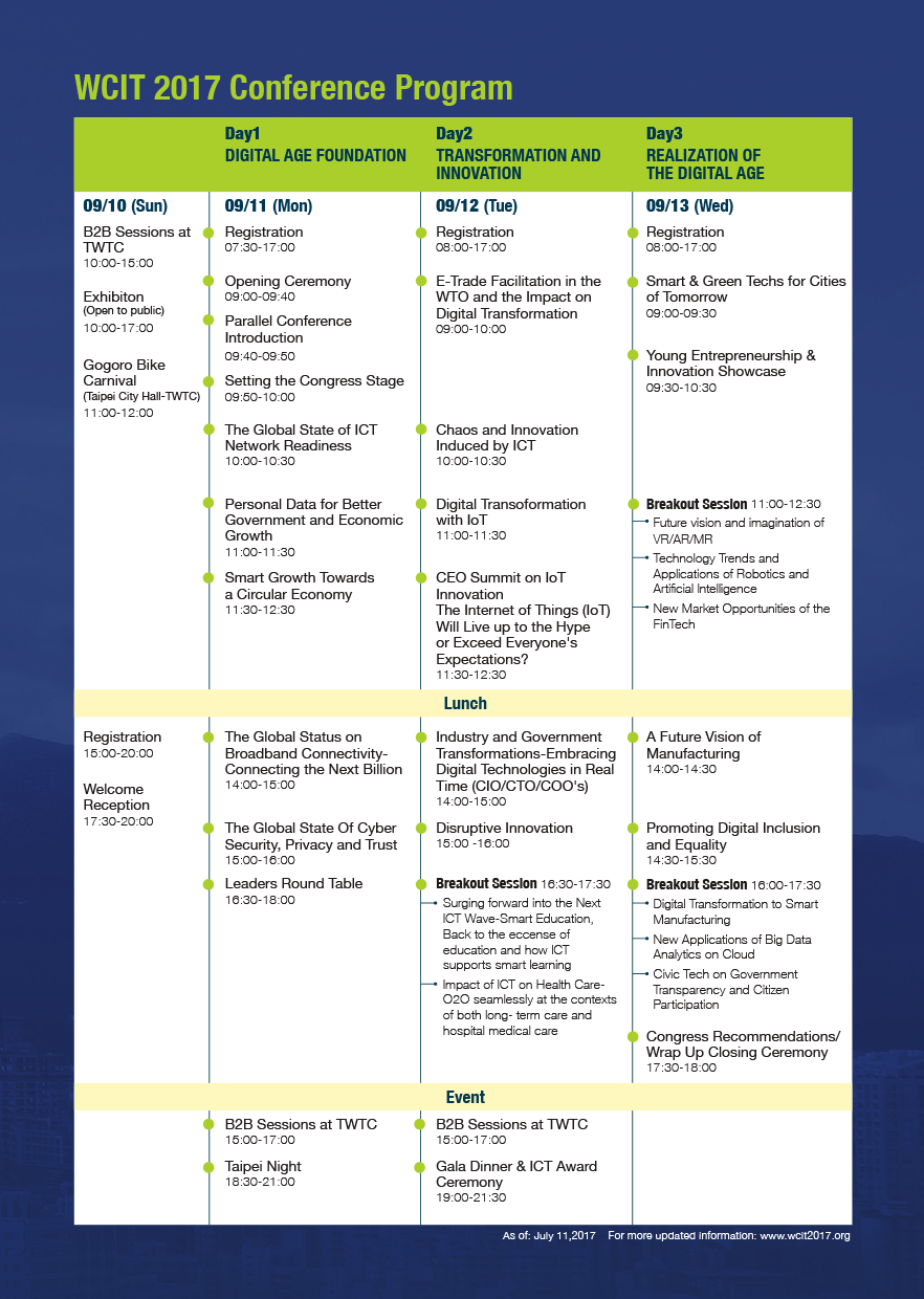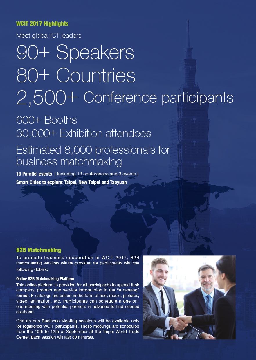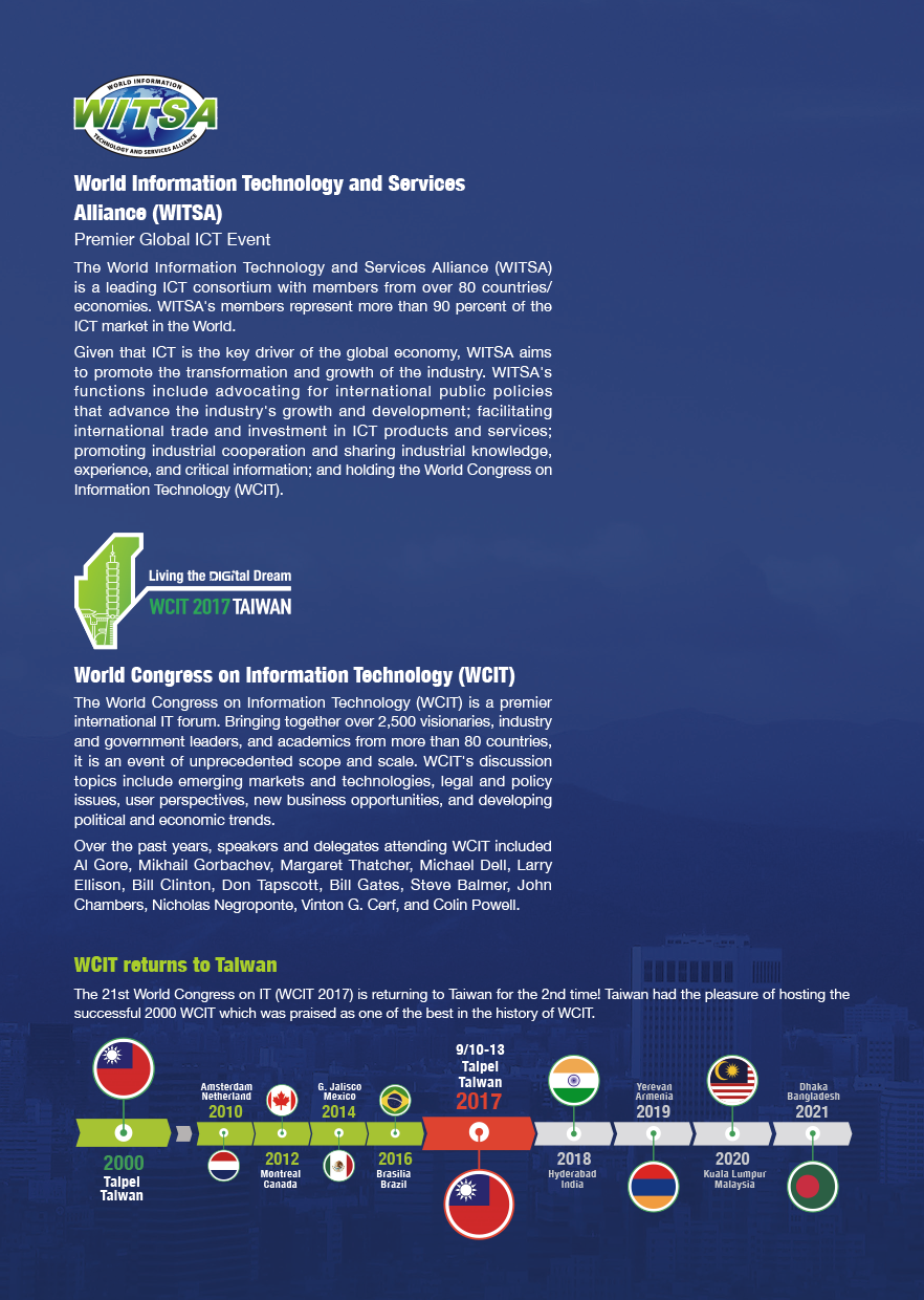 The Embassy wishes to inform the general public that the 21st World Congress on Information Technology (WCIT), as s premier international IT forum, will be held at Taipei International Convention Center (TICC) in Taiwan from 10th-13th September 2017, while its relevant exhibition venue will be at Taipei World Trade Center (TWTC), Exhibition Hall I. Bringing together over 2,500 visionaries, industry and government leaders, and academics from more than 80 countries, it is an event of unprecedented scope and scale. The theme of WCIT 2017 Taiwan is “Living the Digital Dream”.
