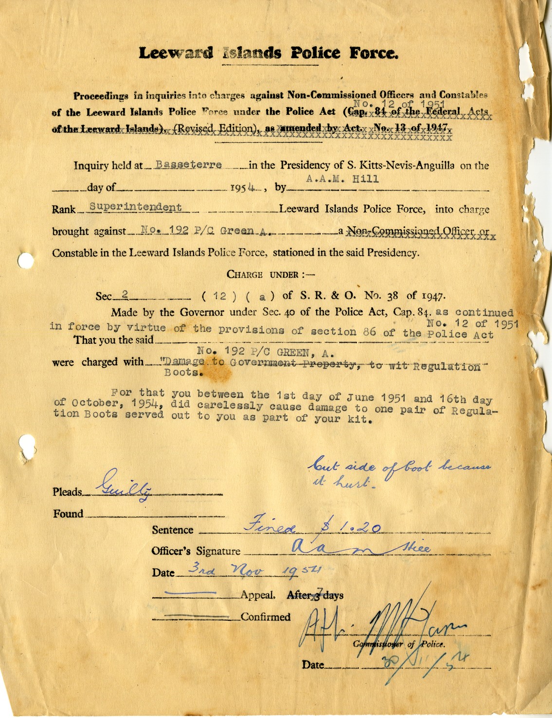 We are continuing with interesting material found in the personnel files of the Leeward Islands Police Force. In 1954 PC Green was charged with causing damage to government property. He had cut the side of a pair of boots issued to him as part of his kit.