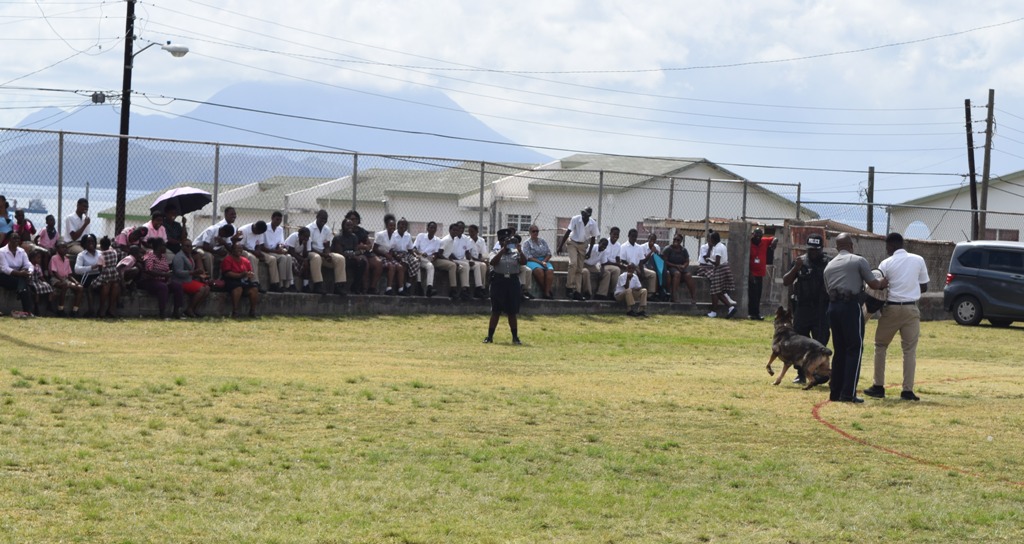 The demonstration, which was held on the Patsy Allers Playing Field on Monday, March 11, was jointly organised by the K-9 Unit and the National Intervention Team which comprises Police Officers. Present were scores of students from the Antioch Baptist Academy, Dr. William Connor Primary, McKnight Day Care Centre and the Cotton Thomas School.