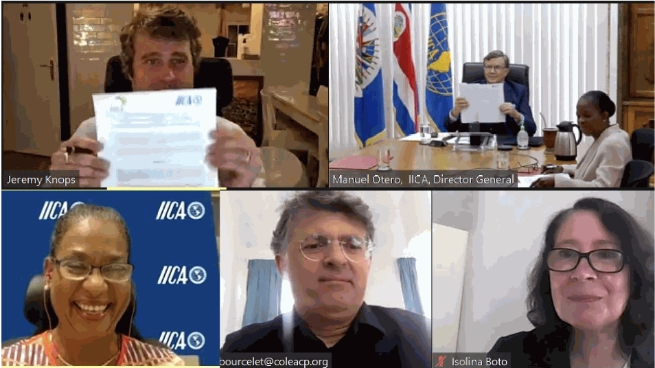 The agreement was signed by Manuel Otero, Director General of IICA, and Jeremy Knops, General Delegate of COLEACP, at a virtual signing ceremony, with both men concurring that the organizations’ networks, methodology and accumulated experience would serve as a powerful catalyst to transform agriculture in these regions.
