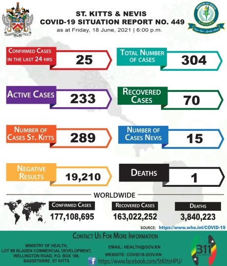 Basseterre, St. Kitts, June 18, 2021 (SKNIS): According to St. Kitts & Nevis’ COVID-19 Situation Report for Friday 18th June, 2021, the positive cases of COVID-19 have increased by 25 from the report given the day before.