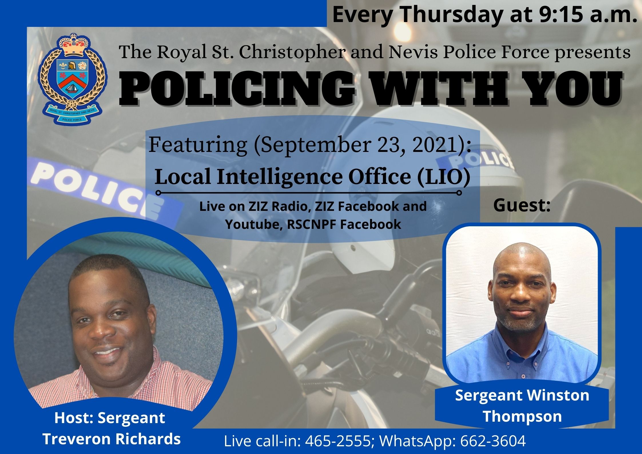 Equally important to the Policing that’s visible to the public, is the type of Policing that takes place behind the scenes like collecting and analysing data. This job falls primarily in the hands of the staff of the Local Intelligence Office (LIO). The information they generate – such as the trends in crimes being committed – directly help with the decision-making process at the highest level in the Police Force. Head of the LIO, Sergeant Winston Thompson, is the special guest on “Policing With You” on Thursday, September 23, 2021. He joins host, Sergeant Treveron Richards, to discuss how the LIO contributes to Policing in the Federation. “PolicingWith You” is aired every Thursday on ZIZ radio from 9:15 a.m. You can also watch it live on the Facebook Pages of The Royal St. Christopher and Nevis Police Force and ZIZ Broadcasting, or catch it on the YouTube Channel of ZIZ Broadcasting. Have a question for our guest? Post it on any of our social media platforms, call 465-2555 or send it via WhatsApp at 662-3604.