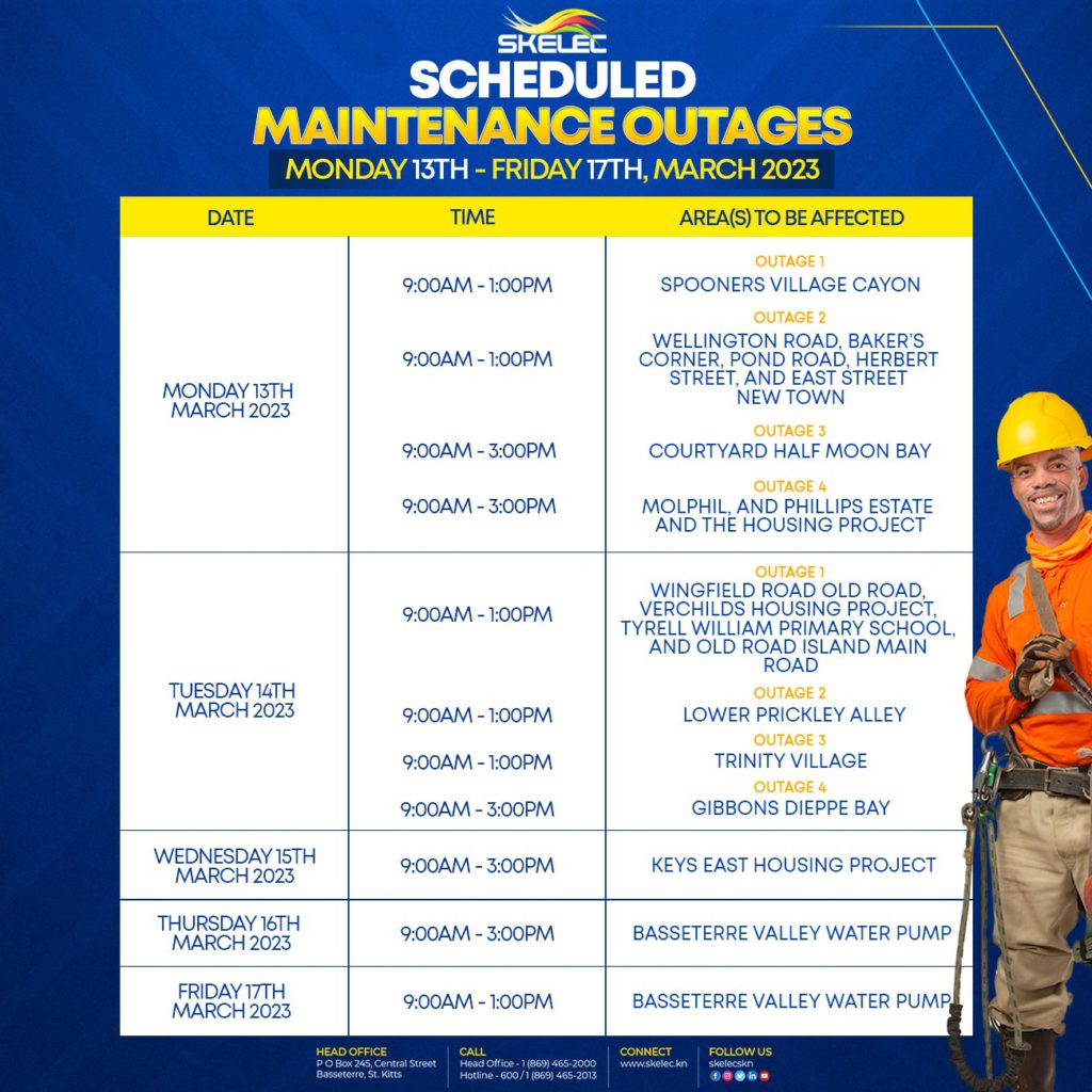 Basseterre, St. Kitts (12thMarch 2023)—The St. Kitts Electricity Company Ltd. is advising the public of scheduled maintenance outages for the week Monday 13th March – Friday 17th March 2023. The scheduled maintenance outages are necessary to perform maintenance as a part of our ongoing efforts to improve reliability.