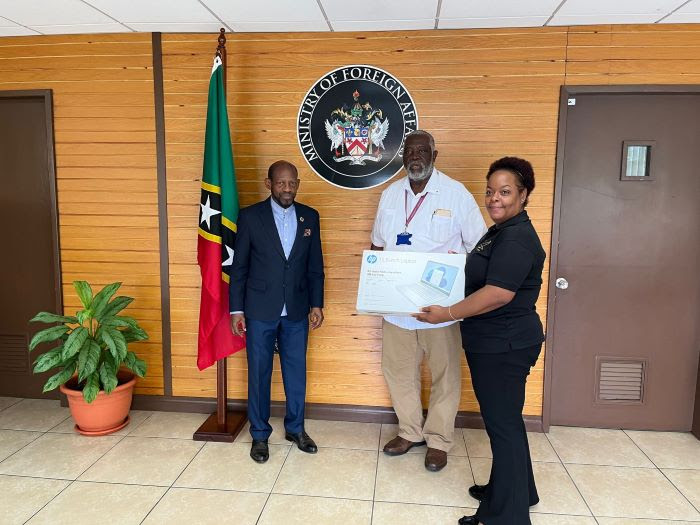 Basseterre, St. Kitts, July8, 2023 (Ministry of Foreign Affairs): Fulfilling a commitment he made to St. Kitts and Nevis’ High Commissioner to the United Kingdom and Northern Ireland, H.E. Dr. Kevin Isaac, on the eve of the April Diplomatic Week of activities, Mr. Uday Nayak, founder of KayanJet and Special Envoy for Economic Development, made a donation of laptop computers through the Ministry of Foreign Affairs.