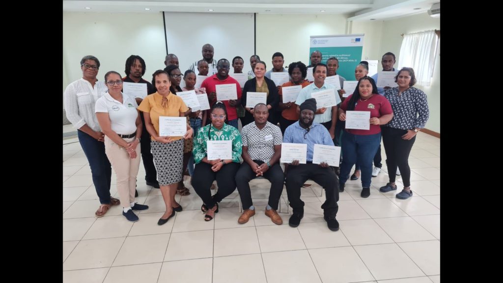 18 July 2023 – Castries, Saint Lucia – Twenty-two agricultural extension officers from Antigua and Barbuda, Dominica, Grenada, Saint Kitts and Nevis, Saint Lucia, and Saint Vincent and the Grenadines successfully completed a week-long training in the Farmer Field School (FFS) methodology held in Union, Saint Lucia from June 12 to 16, 2023. The Food and Agriculture Organization of the United Nations (FAO) and the Saint Lucia Ministry of Agriculture, Fisheries, Food Security and Rural Development hosted the training, which was funded by the European Union through the Programme for Capacity Building Related to Multilateral Environmental Agreements in ACP Countries Phase III (ACP MEAs 3). The training will assist farmers in adopting more sustainable and ecosystem-friendly agricultural practices.