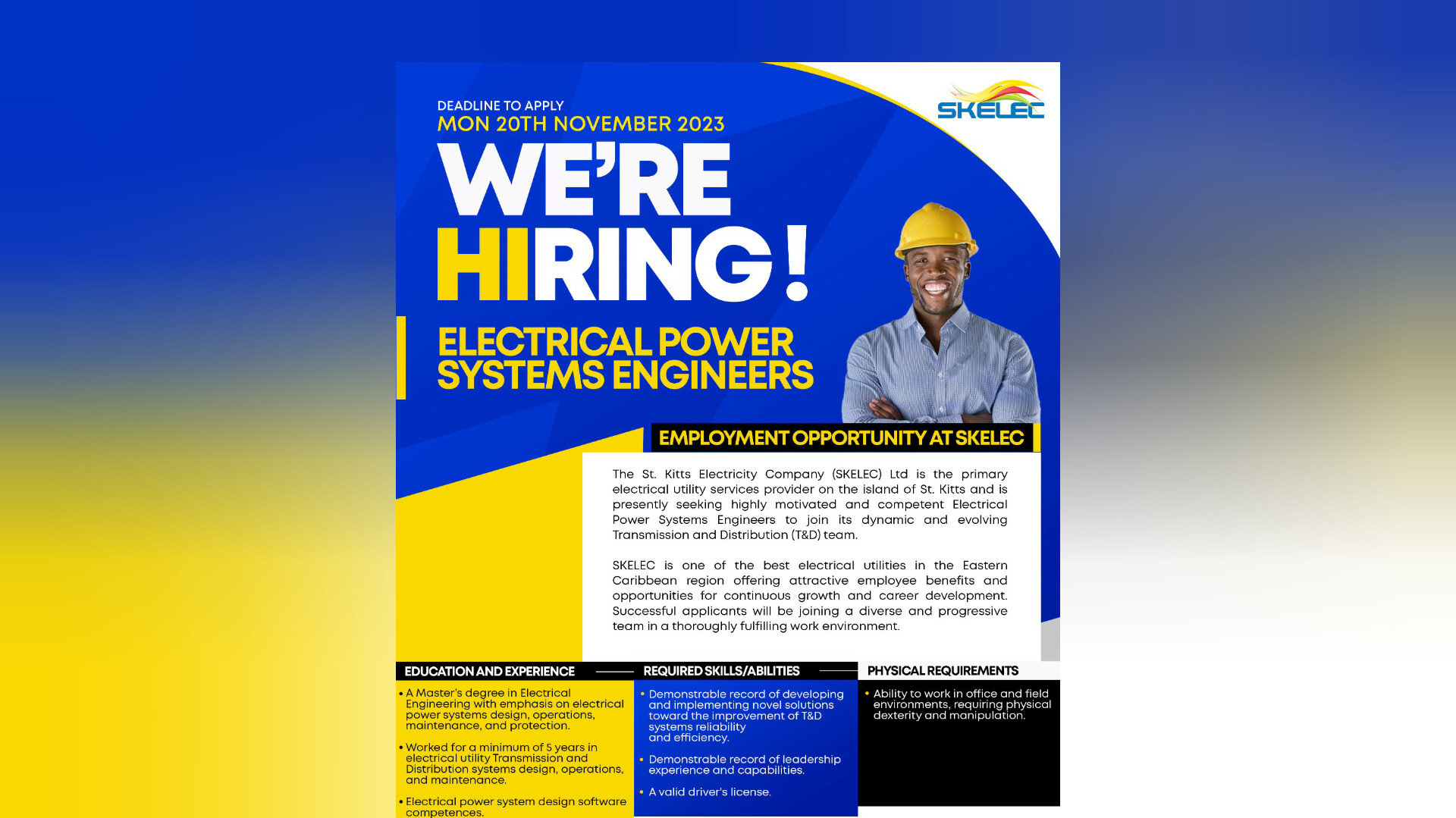 Basseterre, St. Kitts (October 25th, 2023)— The St. Kitts Electricity Company (SKELEC) Ltd is the primary electrical utility services on the island of St. Kitts and is presently seeking highly motivated and competent electrical power systems engineers to join its dynamic, and evolving Transmission and Distribution (T&D) team. Applicants should possess the following at a minimum: