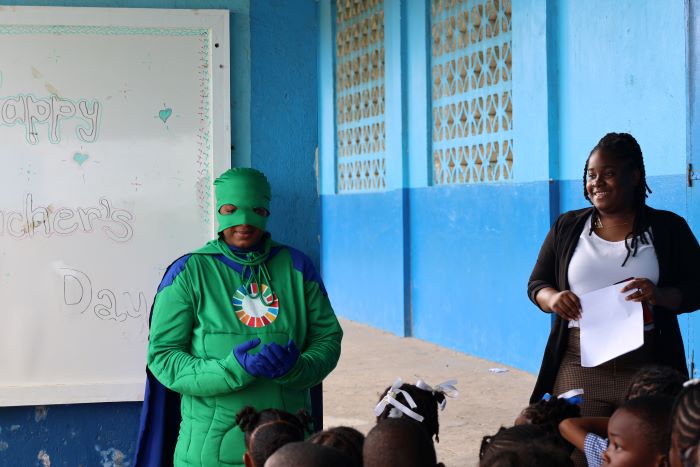 [Basseterre, St. Kitts] – In a thrilling and educational weeklong series of educational sessions taking place throughout various primary schools in St. Kitts, the Ministry of Environment, Climate Action, and Constituency Empowerment proudly introduced Captain SDG, the latest addition to the environmental superhero league. The acronym “SDG” derives its inspiration from the United Nations’ Sustainable Development Goals, and Captain SDG is set to become the emblematic advocate for environmental sustainability and responsibility in St. Kitts and Nevis.