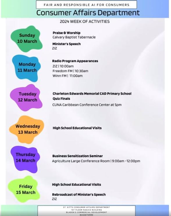 Basseterre, St. Kitts, March 11, 2024 (SKNIS): The Department of Consumer Affairs and by extension the Government and people of St. Kitts and Nevis will celebrate World Consumer Rights Day (WCRD) 2024, with a week of activities from March 10-15.