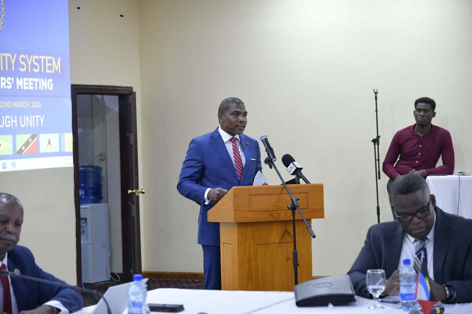 The St. Kitts and Nevis prime minister is supported at the meeting in Guyana by Permanent Secretary in the Ministry of National Security, Cecile Hull; Commissioner of Royal St. Christopher and Nevis Police Force, James Sutton; Commander of the St. Kitts-Nevis Defence Force, J. Anthony Comrie; National Security Advisor Dr. Lionel Rawlins; and Press Secretary to the Prime Minister of Saint Kitts and Nevis, Adelcia Connor-Ferlance.