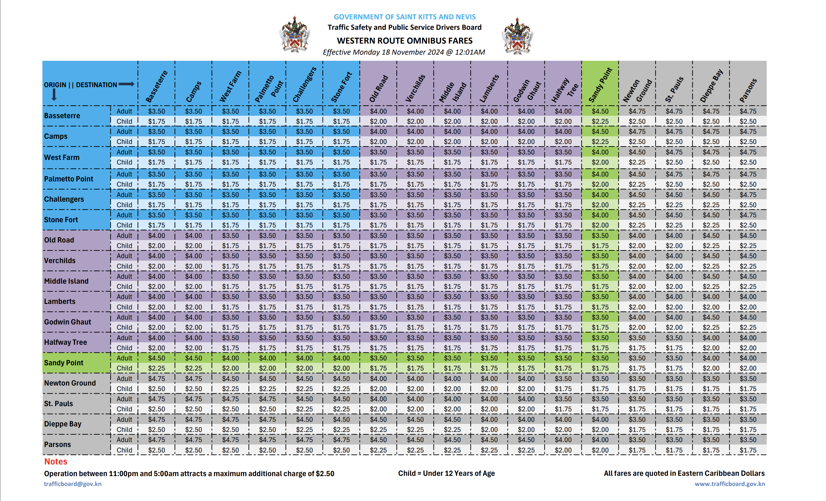 BASSETERRE, ST. KITTS, October 30, 2024: The Federal Cabinet of the Government of St. Kitts & Nevis (“the Cabinet”) has carefully considered and approved the recommendations from the Traffic Safety and Public Service Drivers Board (“the Board”) for an adjustment of the omnibus fare structure on St. Kitts. This decision was not taken lightly, following extensive analysis over the past year to ensure the most balanced outcome for all.