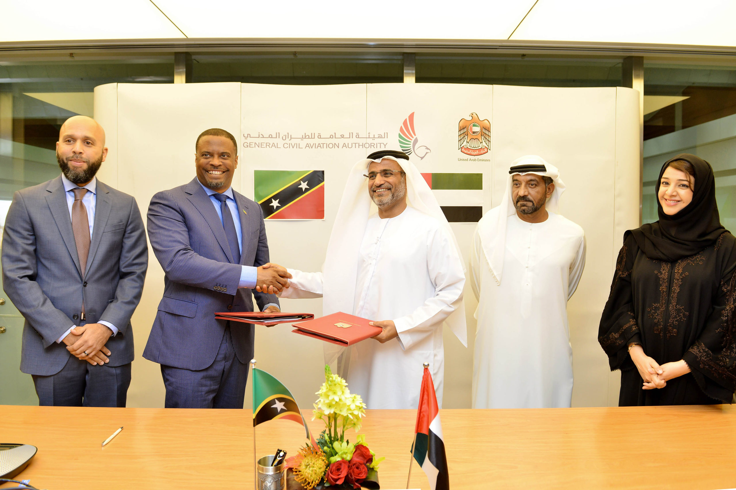 Dubai, United Arab Emirates (20 November 2016) – Today 20th November, 2016 marked an historic day in the relationship between St Kitts and Nevis and the United Arab Emirates as officials of both countries met in Dubai to sign an Air Services Agreement which is intended to pave the way for future air traffic between the two countries. In a high level ministerial meeting before the signing, St Kitts Nevis Foreign Minister Mark Brantley met with His Highness Sheikh Ahmed bin Saeed Al Makotoum, (Chairman and CEO Emirates Airline, Dubai Aviation City Corporation, Dubai World, Flydubai, Noor Islamic Bank PJSC, Noor Investment Group, Noor Takaful General PJSC, and Noor Takaful Family PJSC) and Her Excellency Reem Ebrahim Al-Hashimi (Minister of State and Cooperation and Managing Director for the Dubai World Expo 2020 Bid Committee) to discuss a wide range of issues centred around the deepening and broadening of relations between St. Kitts and Nevis and the UAE.