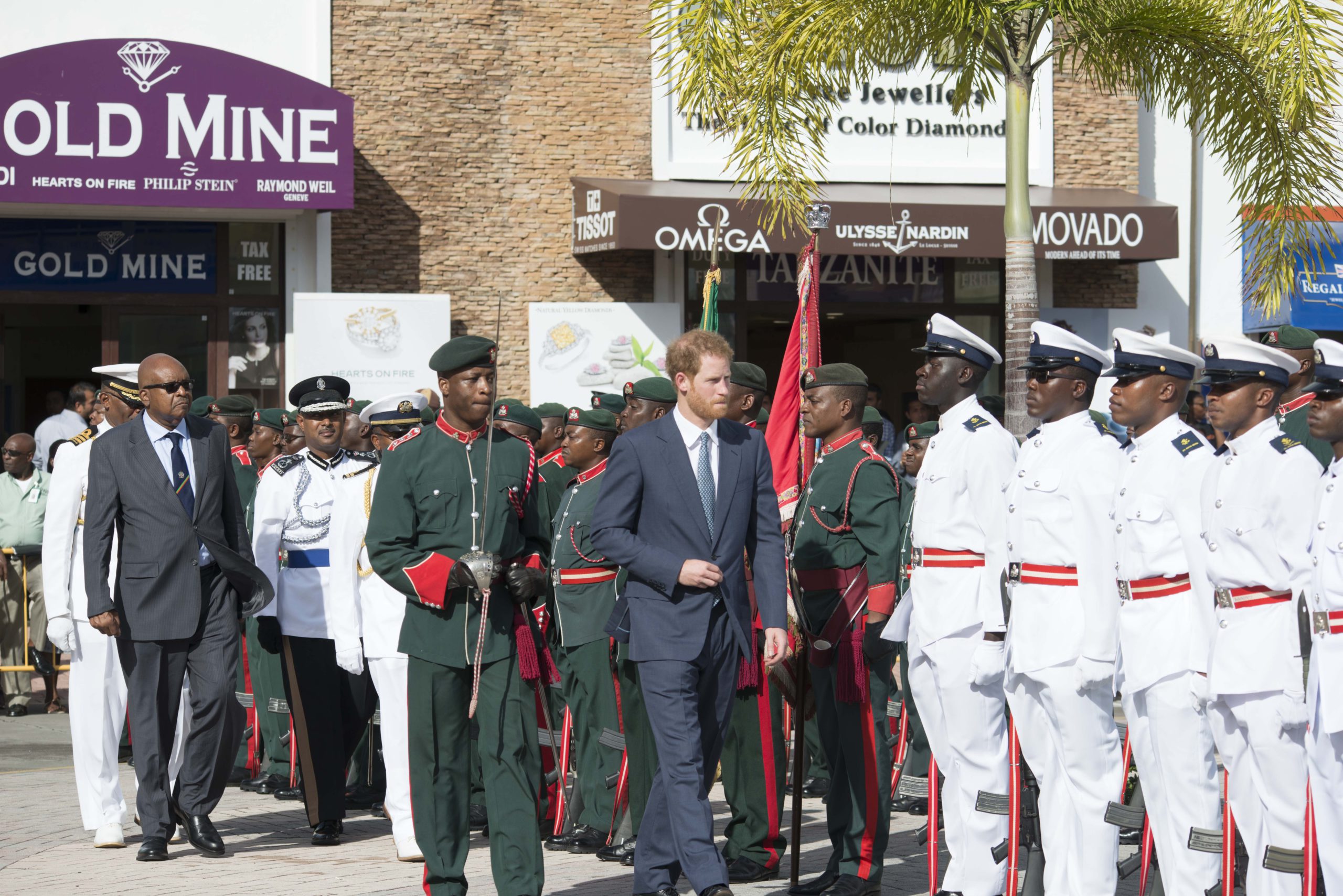 At Port Zante, Prince Harry smiled graciously as his arrival at the cruise pier was met with cheers and applause of several spectators who had gathered. Accompanied by St. Kitts and Nevis’ Governor General, His Excellency Sir S. W. Tapley Seaton, Prince Harry stood at the Saluting Dias to be given a royal salute by representatives of the Royal St. Christopher and Nevis Police Force and the St. Kitts-Nevis Defence Force and its Coast Guard Unit that made up a Guard of Honour.