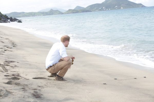 Prince Harry got firsthand experience from the Nevis Turtle Group where leatherback turtles come ashore to lay their eggs which are covered and left to mature and hatch while the mothers return to sea.
