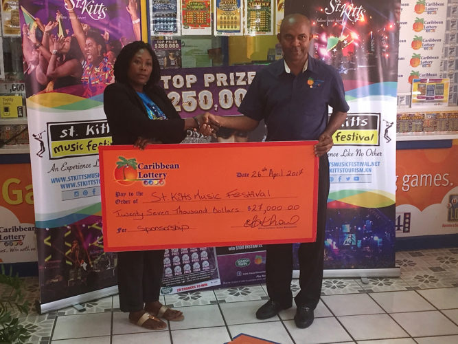 In a brief ceremony at the Caribbean Lotto’s corporate office on Wednesday, 26th April, Caribbean Lotto Marketing Manager Cecil Greene handed over a cheque in the amount of EC$27,000 to Karen Ford, the head of the Sponsorship Committee of the St. Kitts Music Festival.