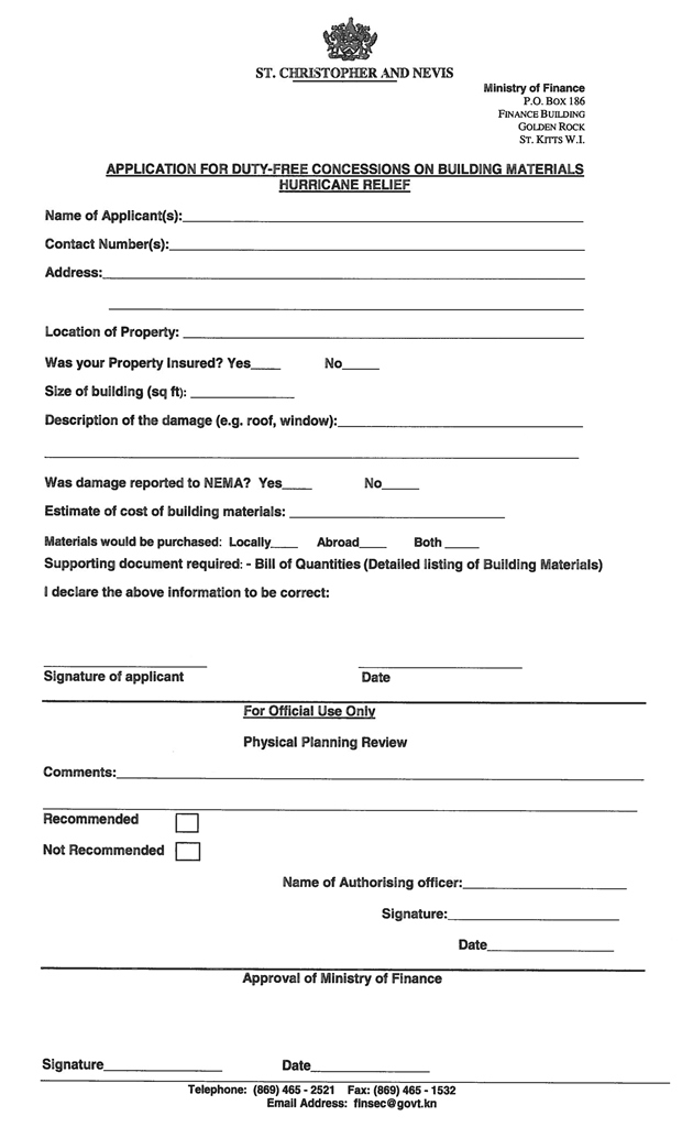 Application forms are available and can be collected at the Ministry of Finance, the Treasury Department, Inland Revenue Department, NEMA, or downloaded from the Ministry of Finance’s website at www.mof.gov.kn