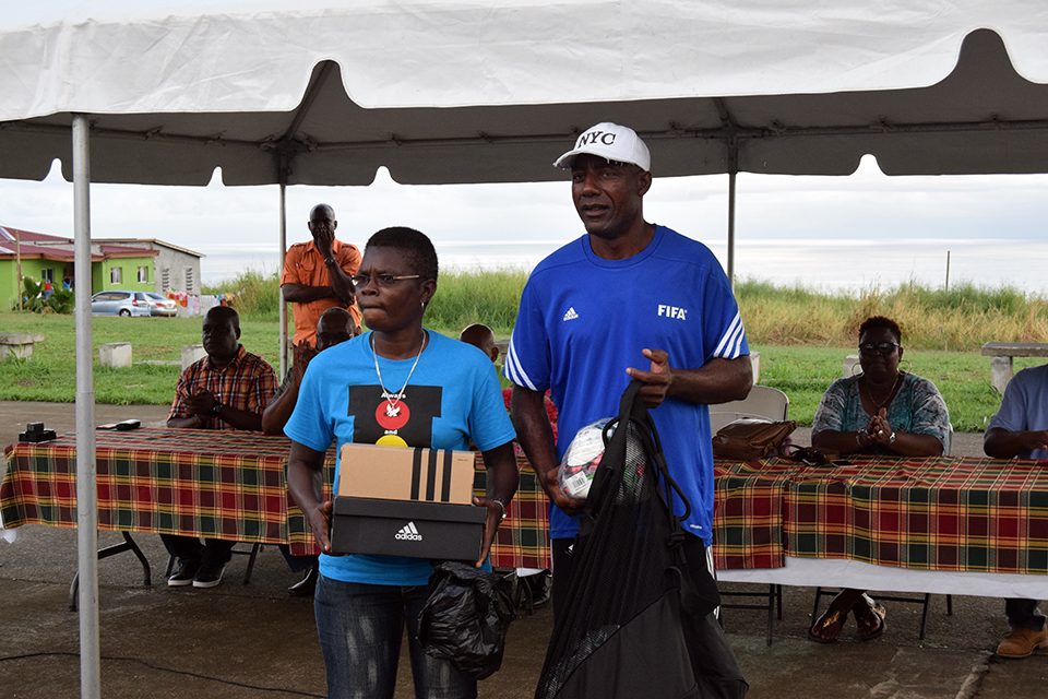 During a ceremony held at the Phillip’s Village Hard Court on Saturday, the Department of Sports, through the Scotiabank Kiddy Cricket programme, presented several pieces of cricket equipment to the youth group, while the St. Kitts and Nevis Football Association (SKNFA) made a similar donation of football gear that will enhance the club’s recreational activities.
