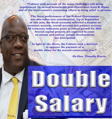 Dr. Harris said, “I appreciate the hundreds who personally, and sent by telephone, WhatsApp, or email their ‘Thank you’ for our decision to pay a double salary. It is an honour to serve the people of #StKittsNevis.”