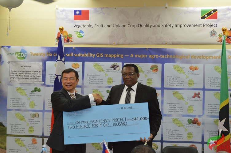 Basseterre, St. Kitts, January 11, 2018 (SKNIS): The Government of the Republic of China (Taiwan) has once again pledged its support to the agricultural industry in the Federation of St. Kitts and Nevis with the Handing Over of the Vegetable, Fruit and Upland Crop Quality and Safety Improvement (VFUCQSI) Project Facility and a cheque to the tune of USD$241,000 for the Eco-Park Maintenance Project.