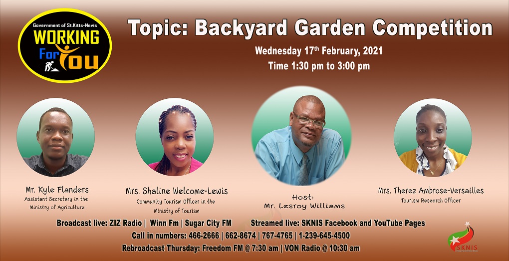 Basseterre, St. Kitts, February 16, 2021 (SKNIS): Officials from the Ministries of Agriculture and Tourism will be featured on the popular government radio and television programme “Working for You” on Wednesday, February 17, 2021.