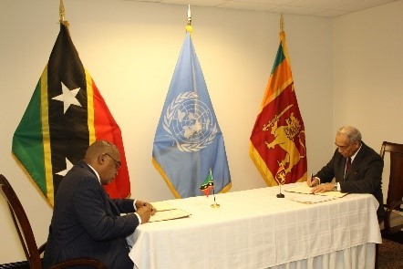 Basseterre, St. Kitts, March 26, 2021 (Ministry of Foreign Affairs): On Monday 22nd March 2021 at a ceremony in New York, H.E. Mr. Ian Liburd, Permanent Representative of the Federation of Saint Kitts and Nevis to the United Nations, and H.E. Mr. Mohan Pieris, Permanent Representative of The Democratic Socialist Republic of Sri Lanka to the United Nations, signed joint communiqués on behalf of their respective Governments. Ambassadors Liburd and Pieris exchanged greetings from their respective Heads of Governments and Foreign Ministers and expressed their desire of building a greater relationship.