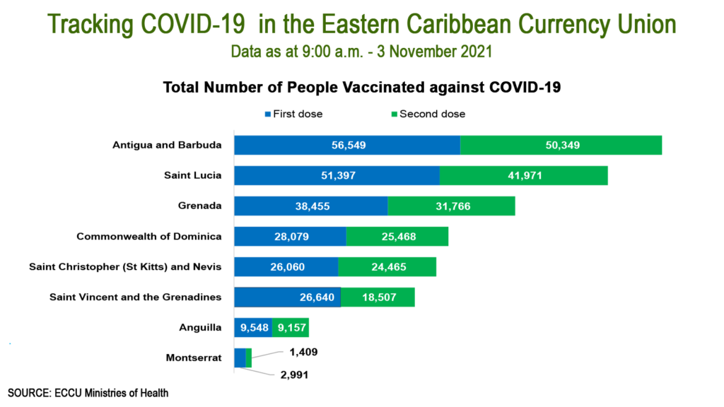 As at 01 November 2021, there have been 35,947 confirmed cases of COVID-19 in the ECCU, with 32,056 recoveries and 680 deaths. (Source: ECCU Ministries of Health)
