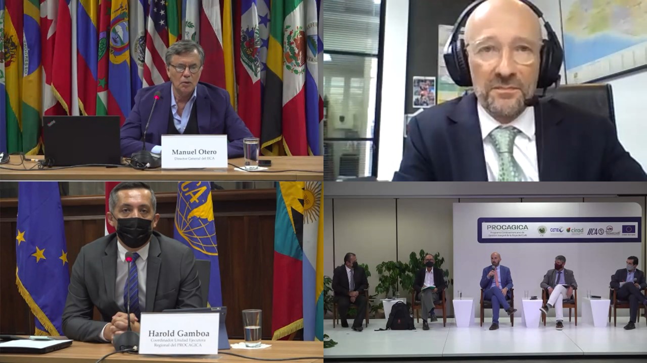 San Jose, 2 December 2021 (IICA). Direct support was provided to 7,334 farmers—34% women and 10% men—belonging to 199 organizations; the production income of coffee farmers was boosted by at least 24%.; and sustainable production models were applied on 10,402 hectares of coffee. These are just some of the achievements stemming from the implementation of the Central American Program for Integrated Management of Coffee Leaf Rust (PROCAGICA) in Guatemala, El Salvador, Honduras, Nicaragua, Costa Rica, Panama and the Dominican Republic.The results of the five-year initiative—funded by the European Union (EU) and executed by the Inter-American Institute for Cooperation on Agriculture (IICA)—were presented at a regional closing event.PROCAGICA aimed to strengthen the resilience of small- and medium-scale coffee farmers to climate change and variability, and to its environmental impact, through the adoption of adaptation and mitigation measures and reduced irrigation. It also sought to increase the profitability of the coffee growing industry and the livelihood of producing families in the region.To this end, it successfully promoted crop diversification to bolster food security; enhanced national early warning systems; conducted scientific research to improve varieties and coffee plant resilience; undertook capacity building for famers and technical extension officers; and developed strategies and policies proposals to bolster the sector.Harold Gamboa, Coordinator of PROCAGICA’s Regional Executing Unit, explained that, in undertaking crop diversification on 4,138 hectares of coffee plantation, the program vastly surpassed its 1,000-hectare goal, managing different crops, such as fruits, in association with already existing ones and introducing new crops, thus giving producing families an additional income stream.Gamboa confirmed that, “Almost 6,400 of the beneficiary farmers reported new sources of income; per hectare coffee production on the farms of the target group of the small- and medium-scale producing families increased between 28% and 42%; and 99% of the program’s farmers effectively managed to control their coffee leaf rust, thereby reducing economic losses”, said Gamboa.