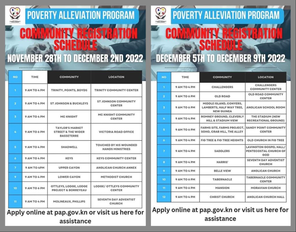Officers from the Department of Community Development and Social Services in St. Kitts, as well as the Department of Social Services on Nevis, will be at key community locations to assist persons requiring assistance to complete the online registration. The venue and time schedule can be found on the official Government and SKNIS websites and Facebook pages and posted at community centres across the Federation.